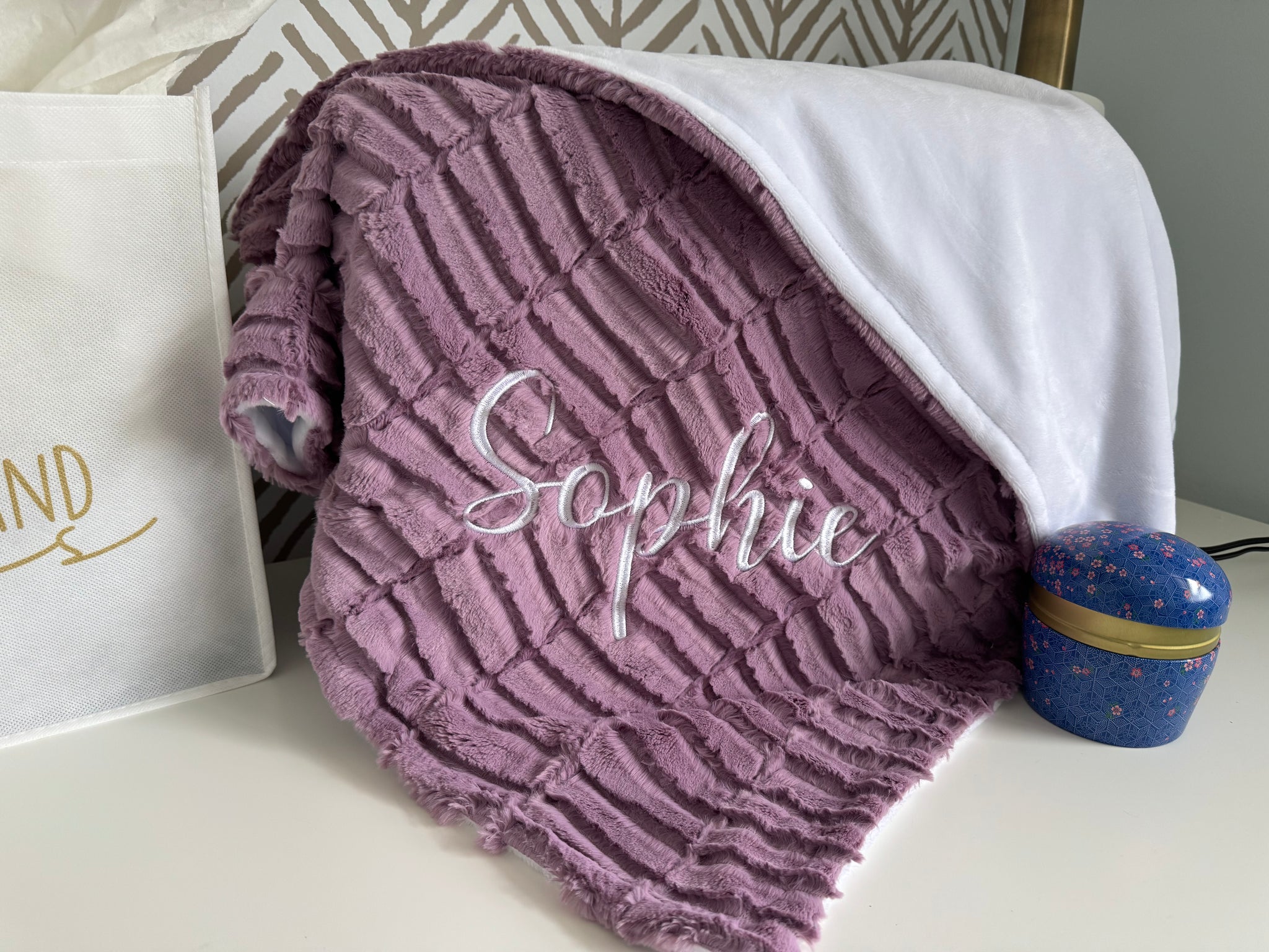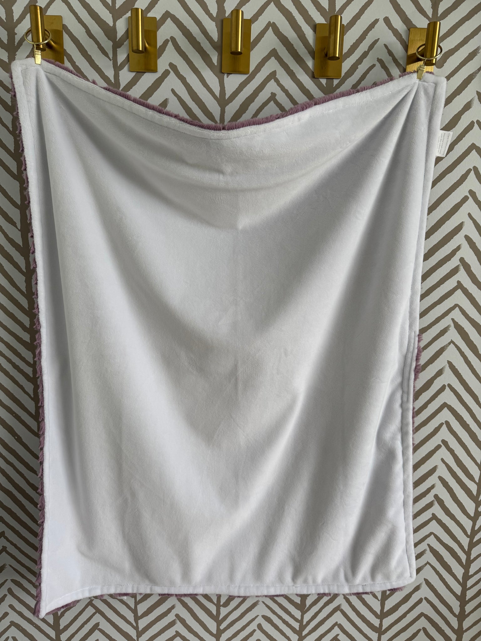 Mauve Oxford blanket with white swirly back, white embroidery & no ruffle.