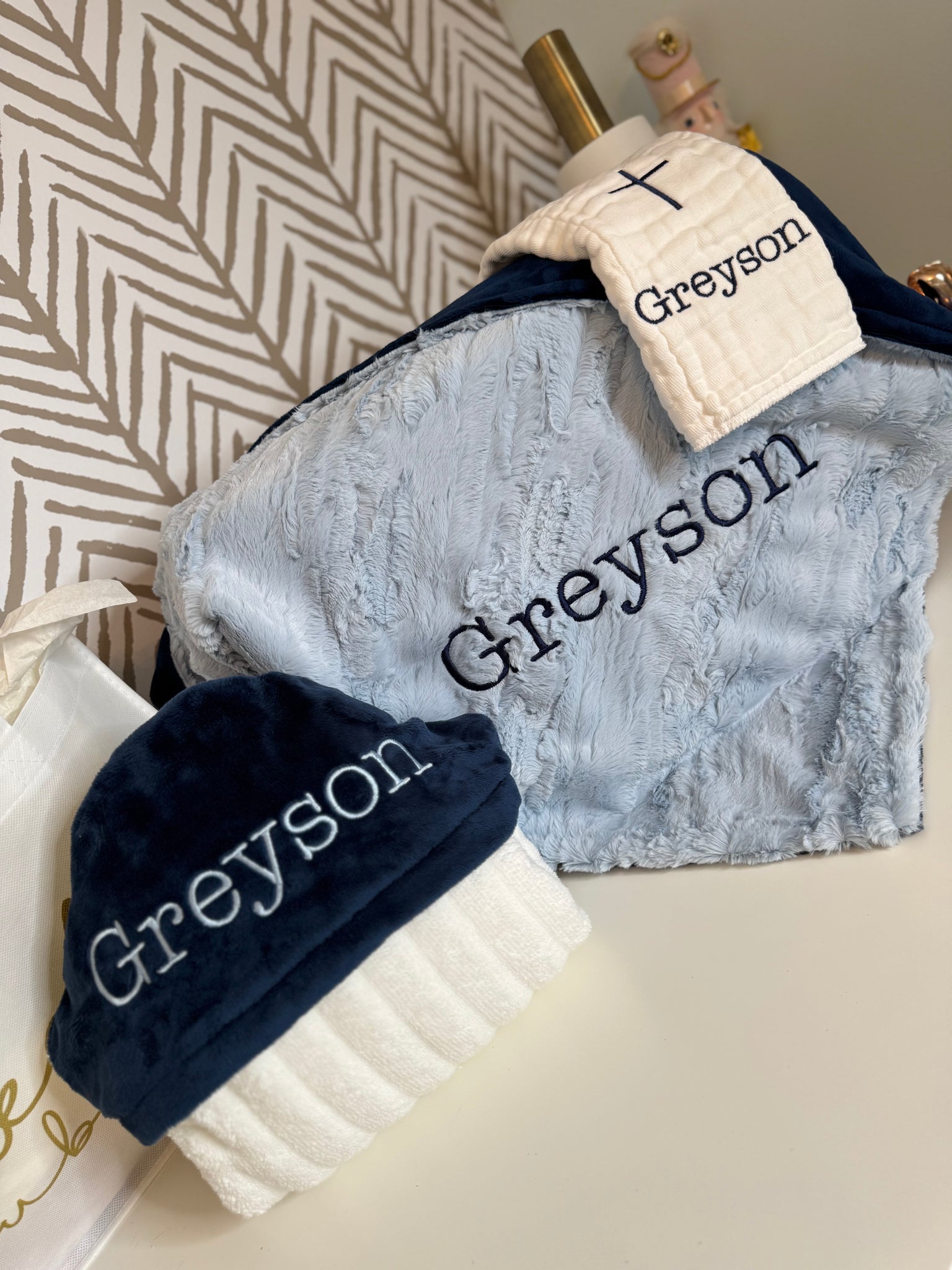 Pricing includes 1 (ONE) name embroidered on each item. Burp cloth includes 1 (one) name or monogram embroidered. An embroidery specialist will contact you within 1-2 business days after placing your order with font options in the style you choose for approval.