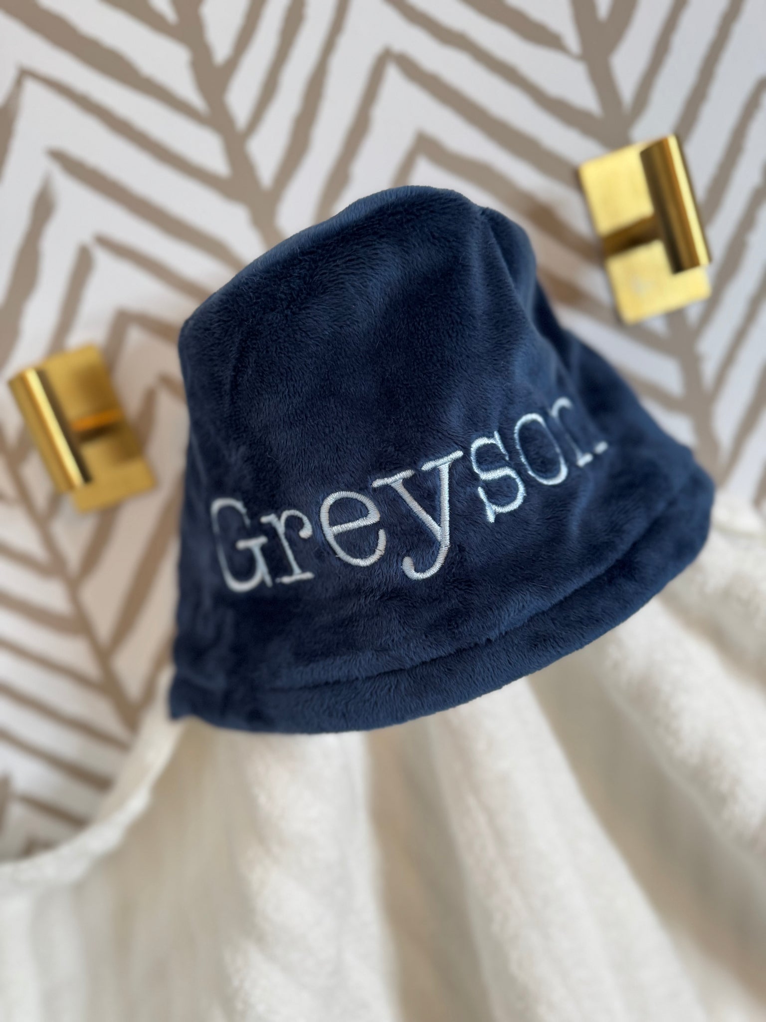 Hooded Towel - Flat navy fabric with dusty blue embroidery.