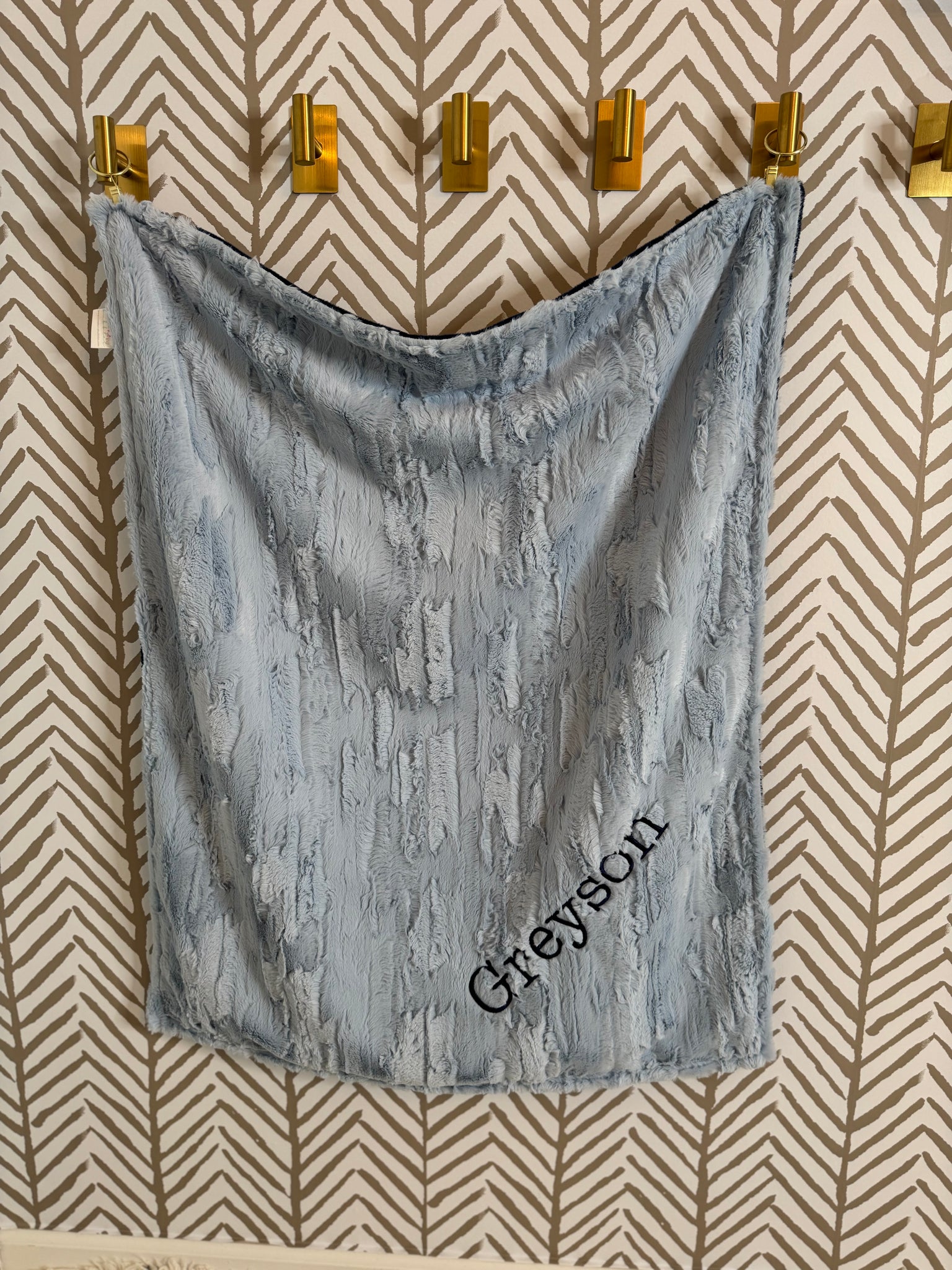 Blanket - Icy blue willow fabric, flat navy back, navy embroidery no ruffle.