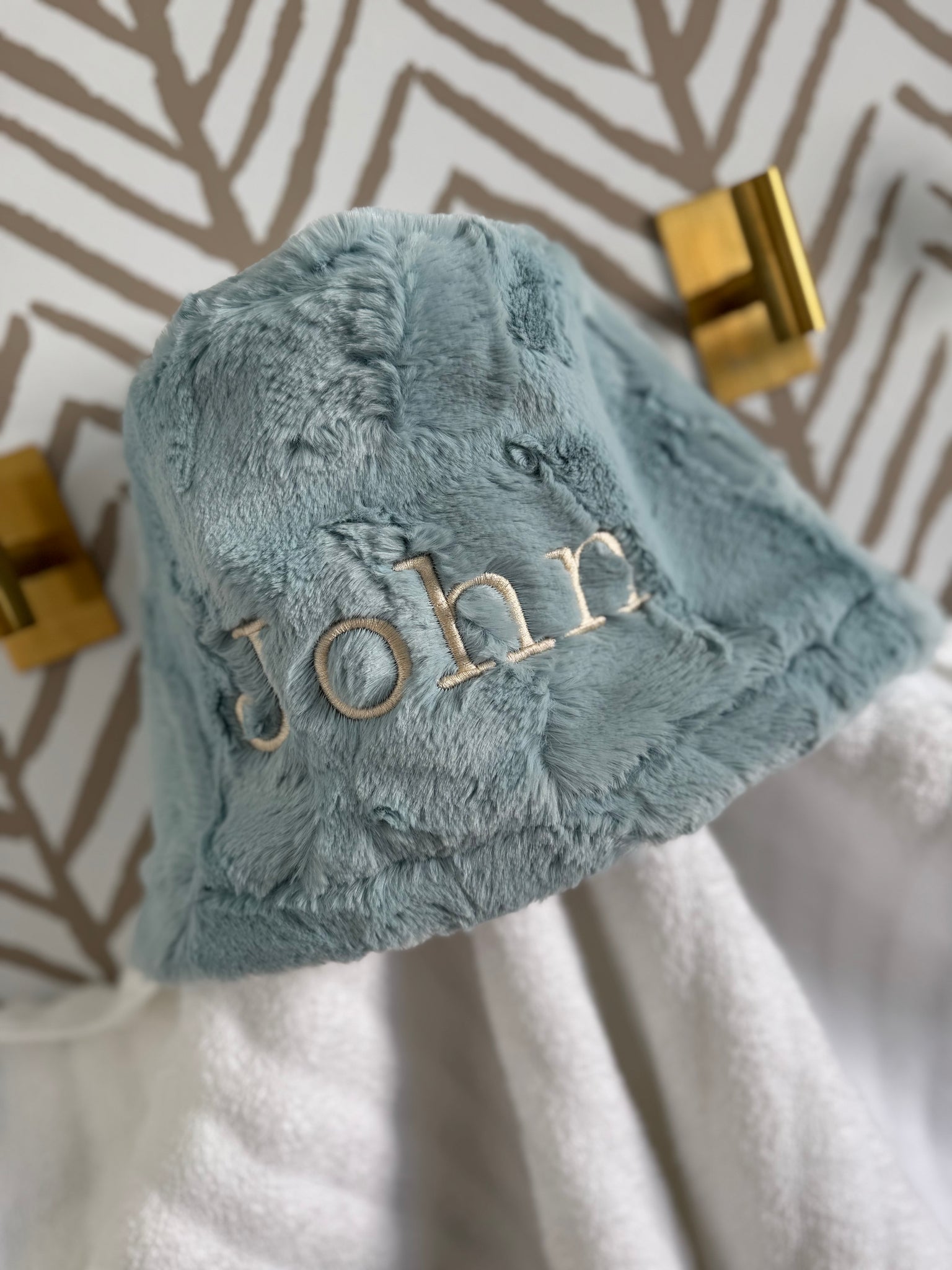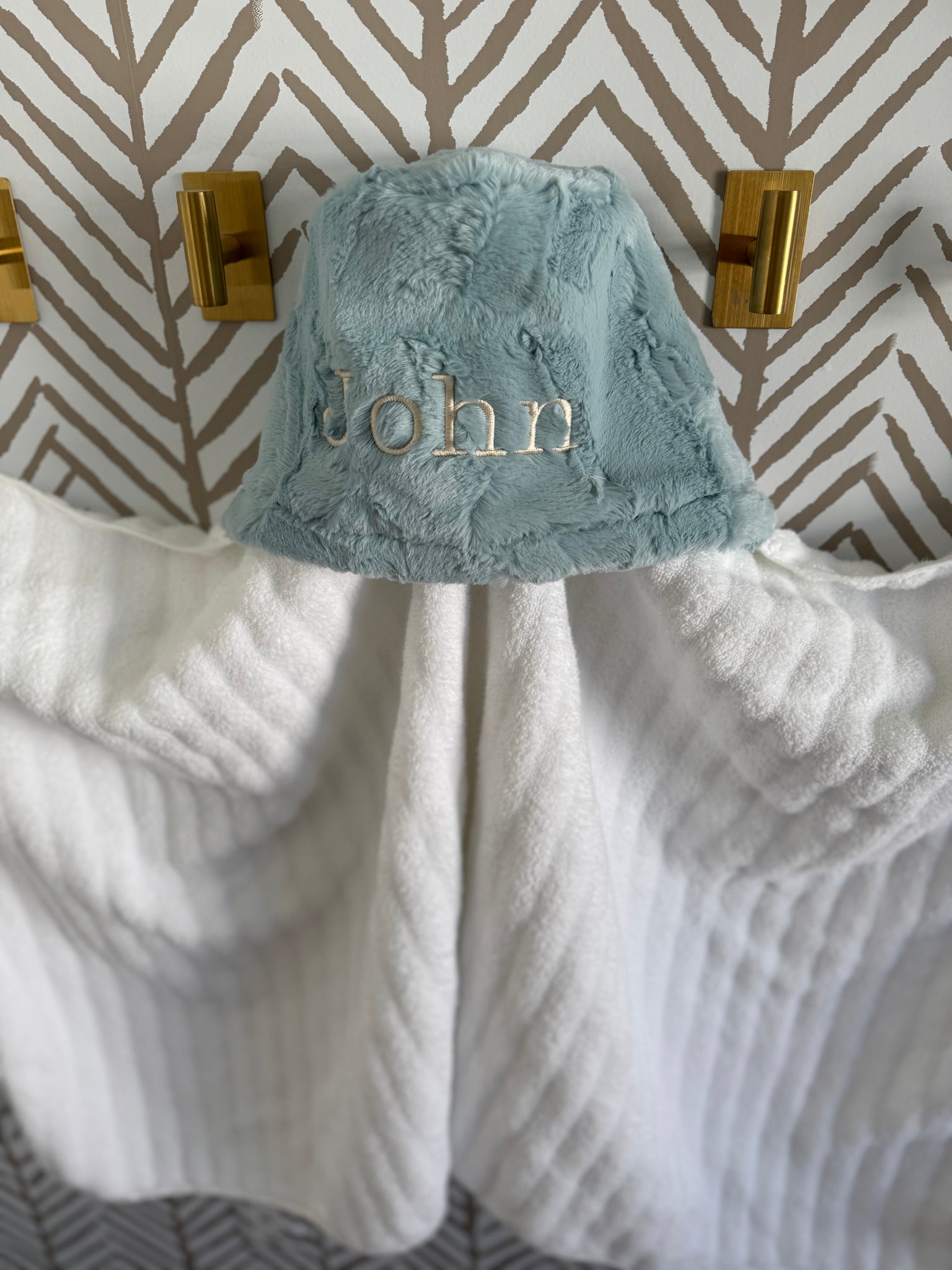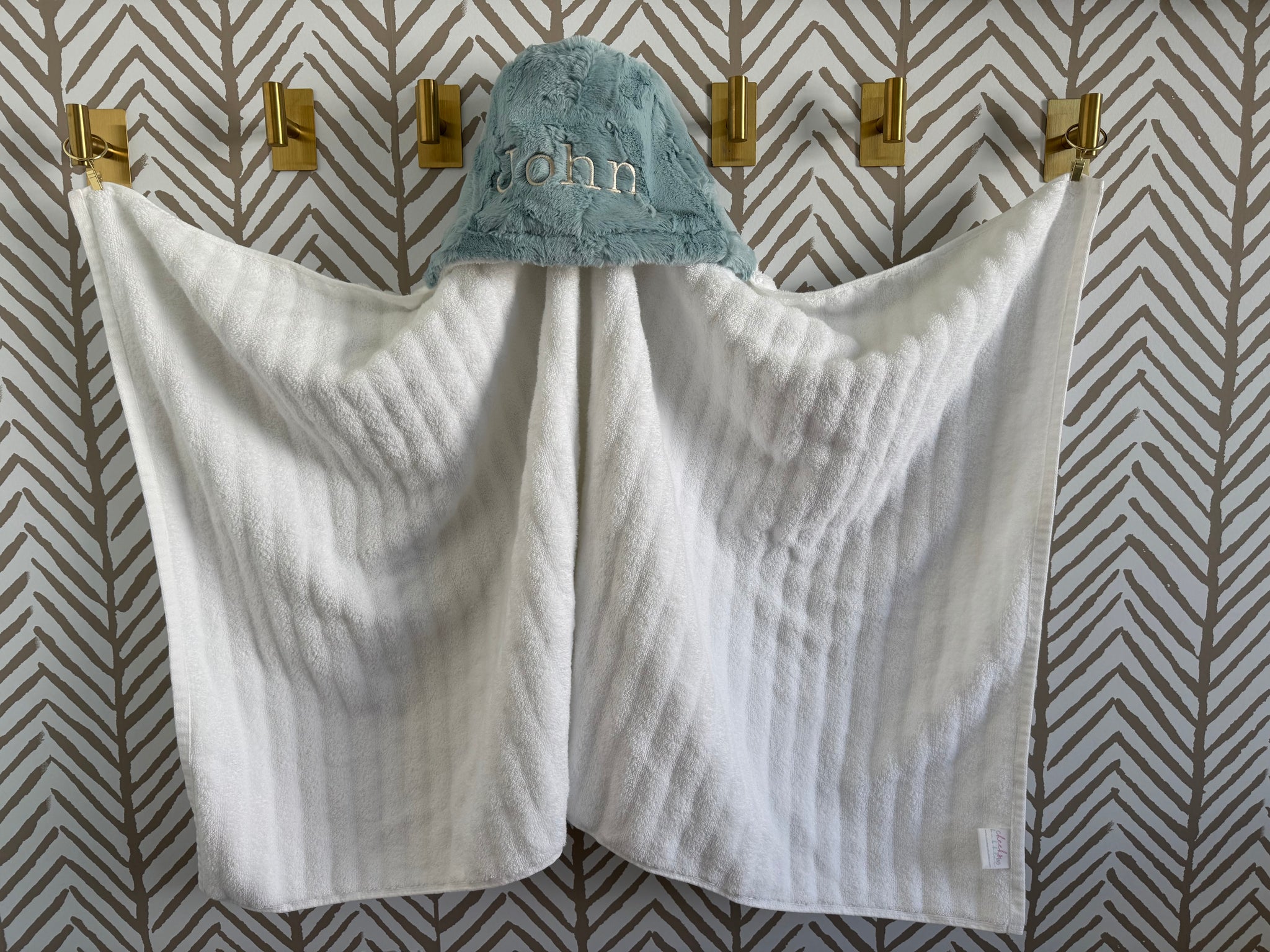 Mist Hyde with pearl embroidery hooded towel.
